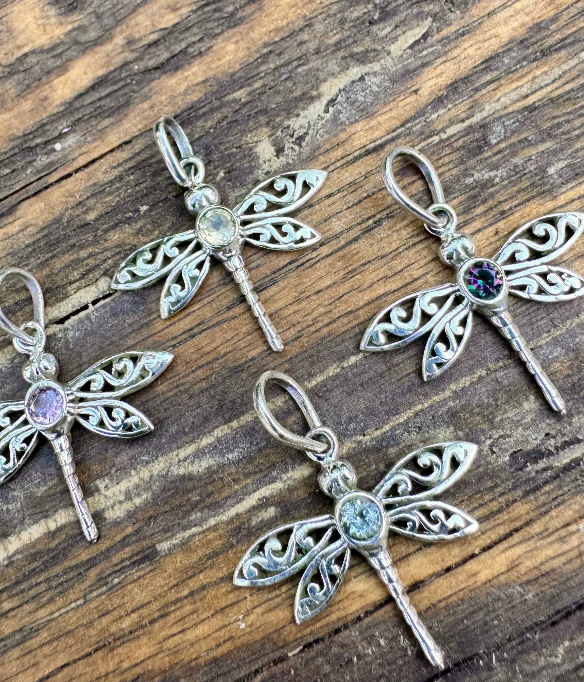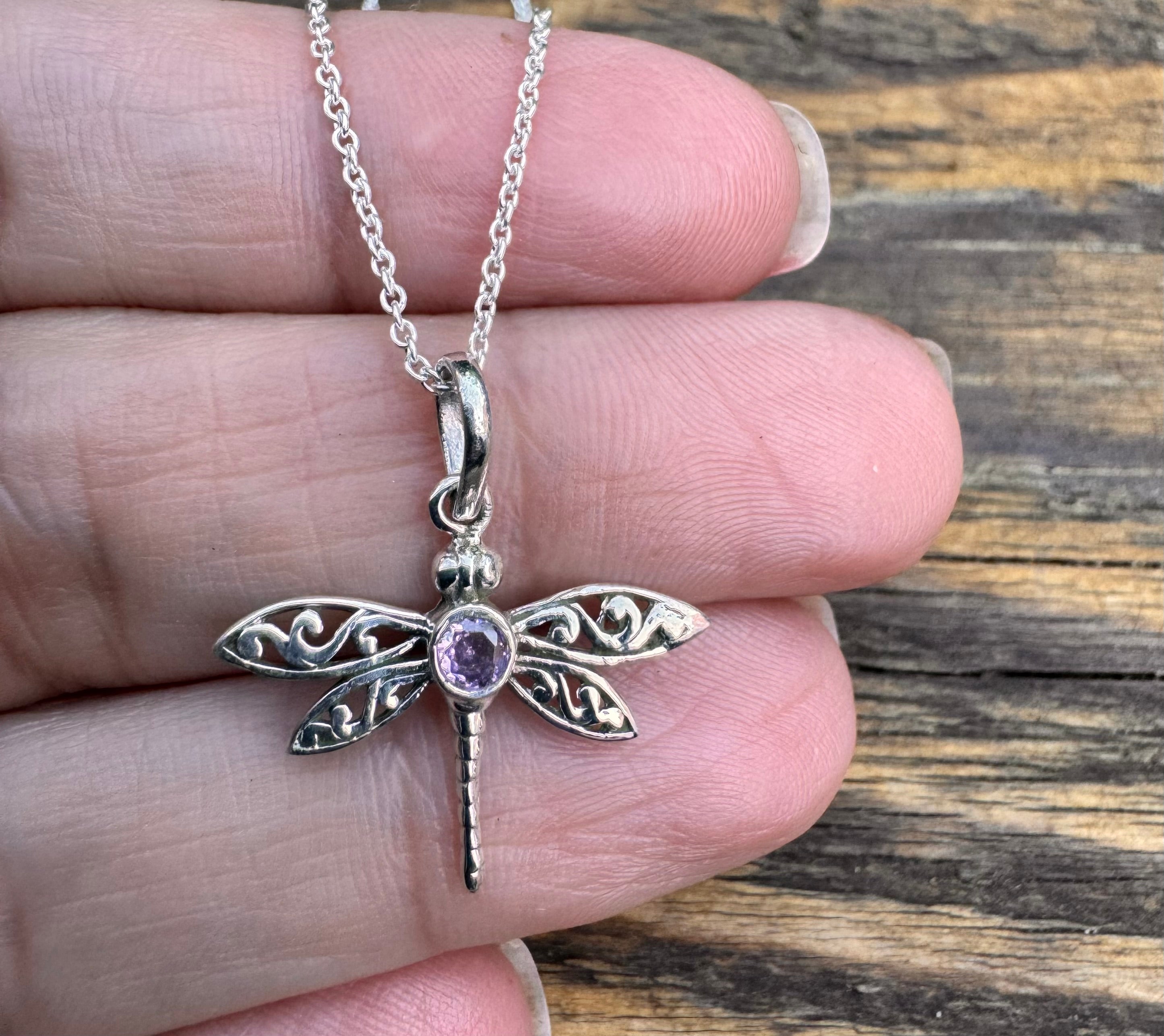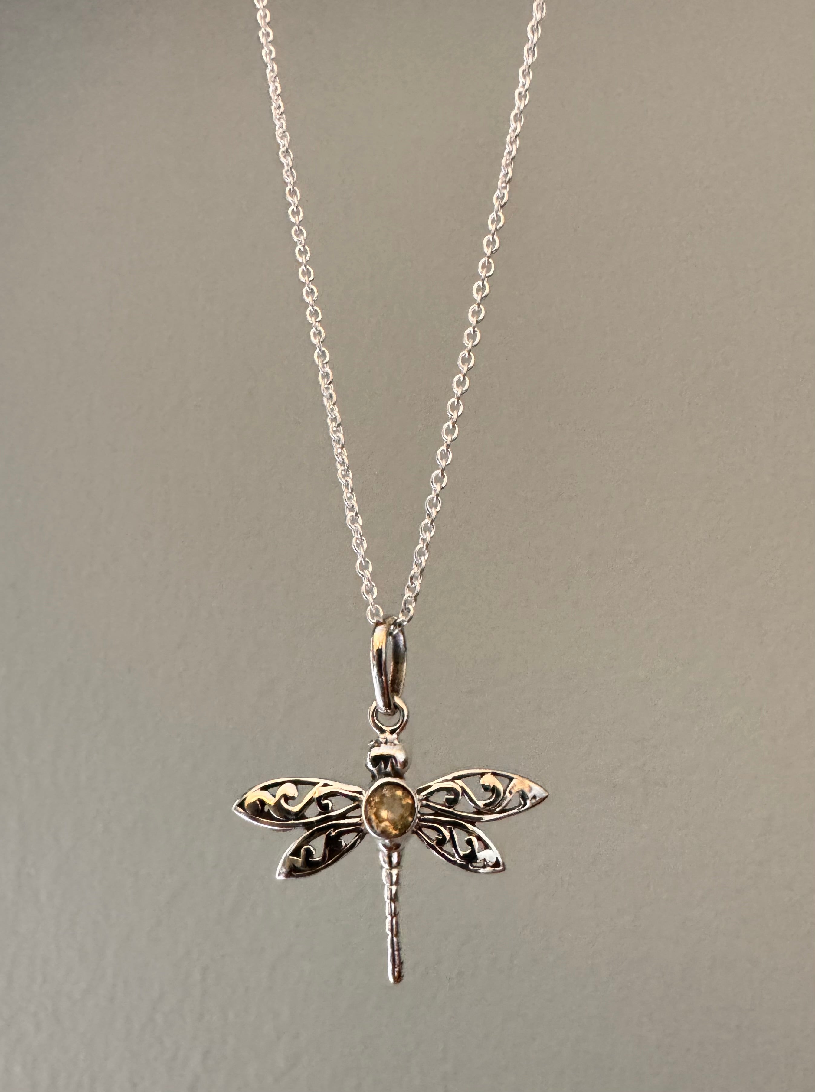 A reminder of growth and transformation. Our sterling silver dragonfly necklace features a gemstone centre and represents change, strength and new beginnings. (Gemstone may vary based on availability.)