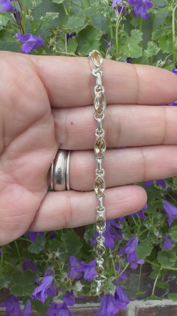 This bright and cheerful bracelet features 10 faceted marquise-shaped Citrine gemstones set in solid 925 sterling silver. Known as the stone of joy and abundance, Citrine brings a warm golden glow to any look. A perfect gift for November birthdays, anniversaries, or anyone who loves sunny, uplifting energy.