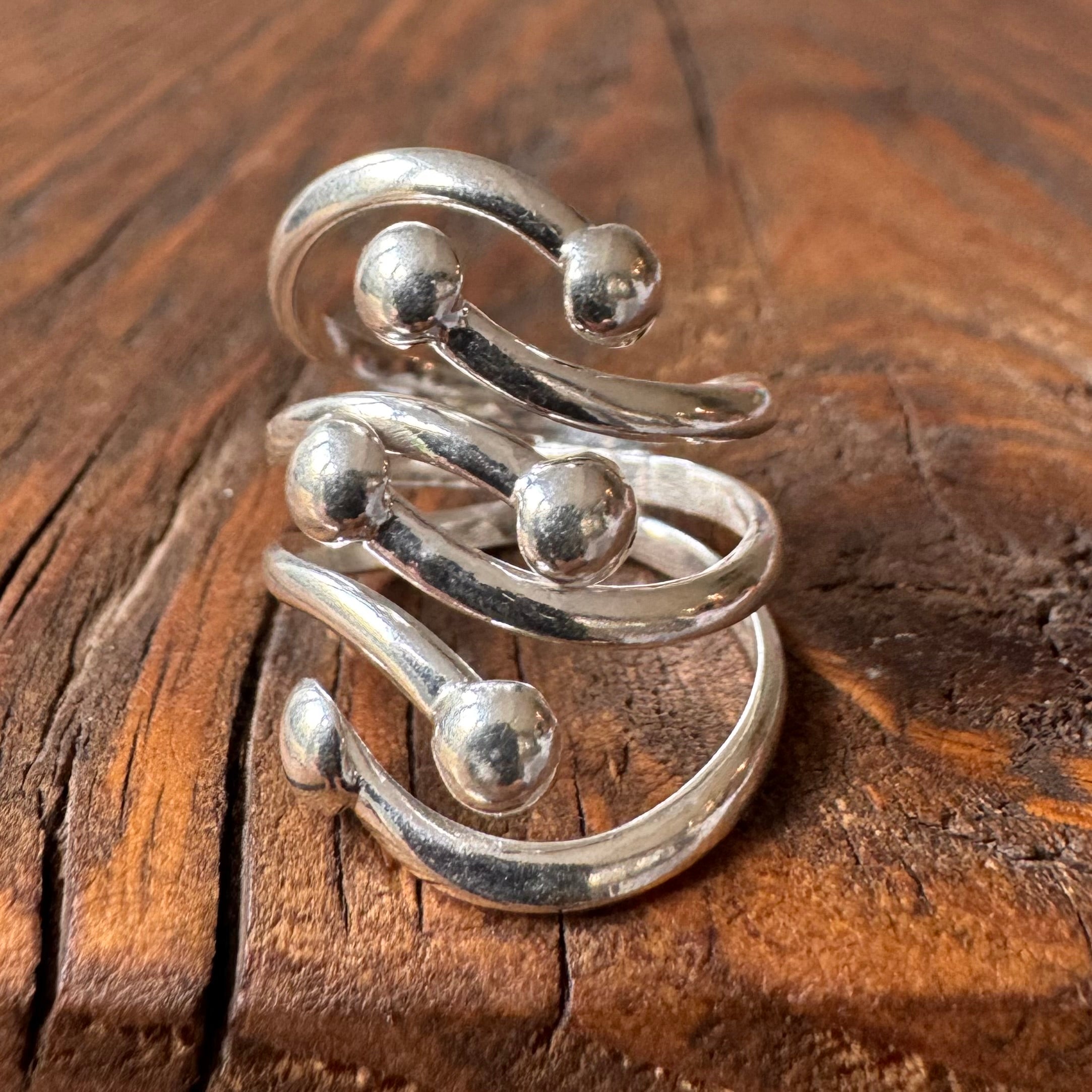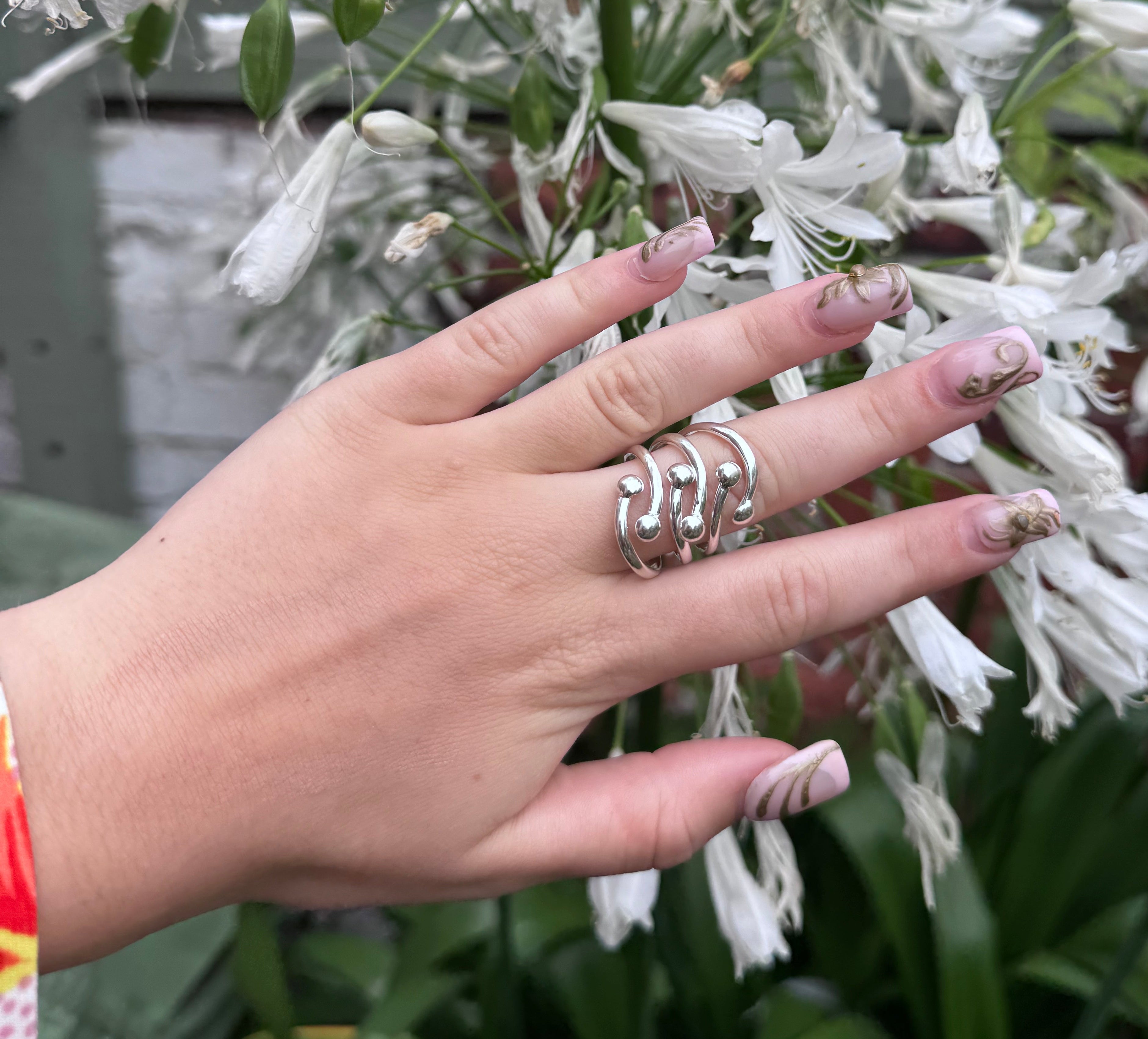 This bold 925 sterling silver ring features a wrap-around design with multiple polished bands, each ending in a rounded dome. Its sculptural form creates a stacked look in one piece, offering a statement style that’s both playful and modern.