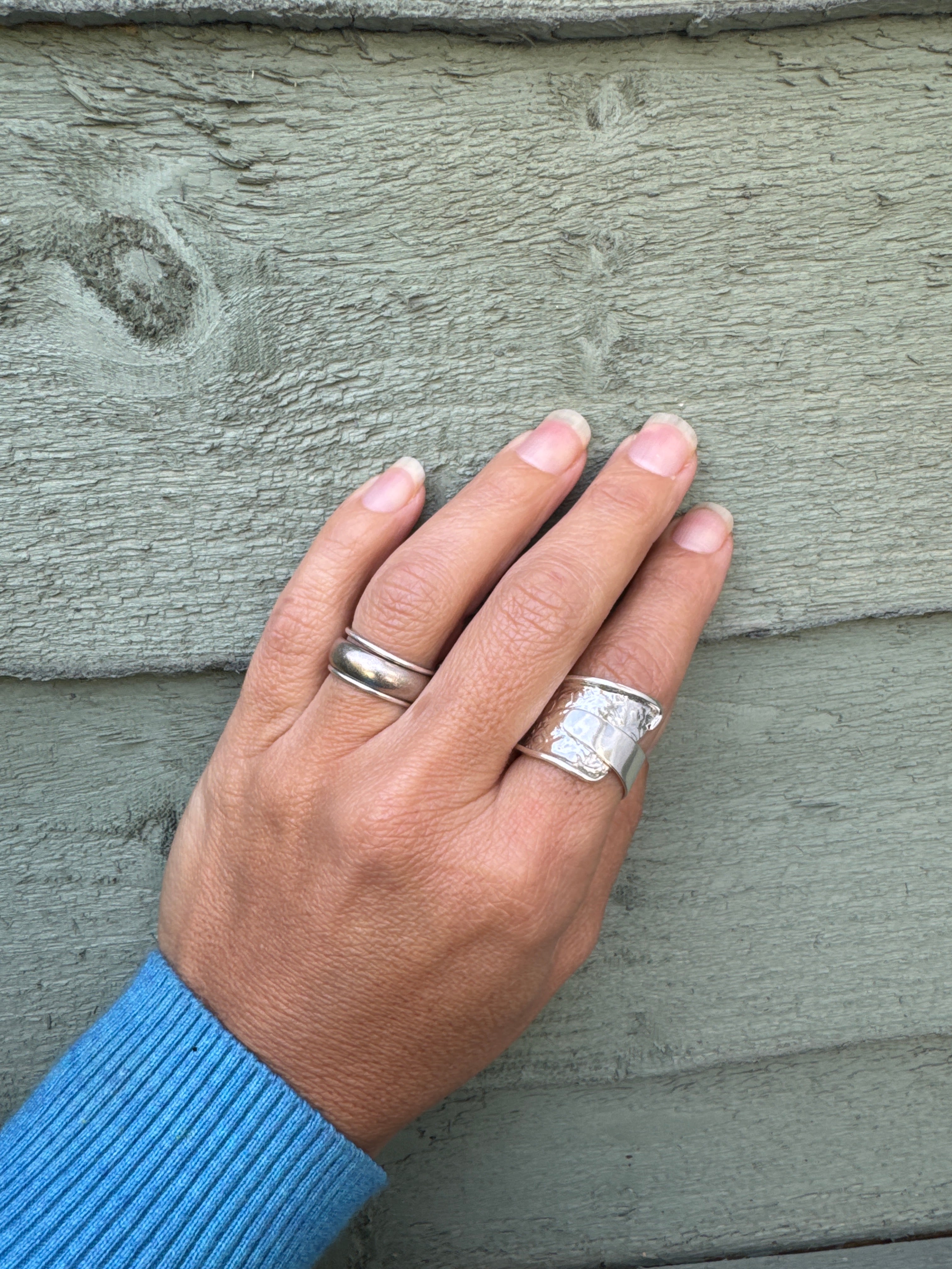 A sterling silver ring shaped like a leaf, wrapped gently around the finger. Adjustable for a comfortable fit.